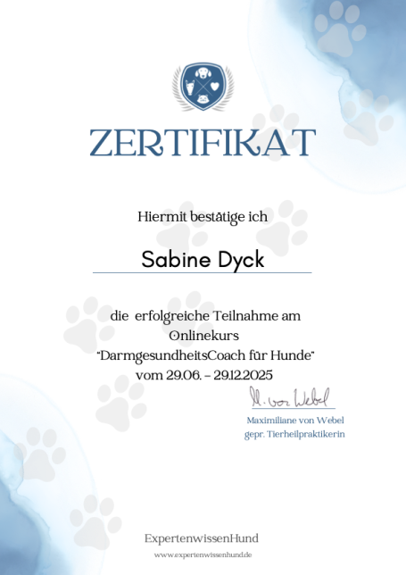Seit über 15 Jahren bin ich als Ernährungsberaterin für Hunde tätig und habe mich kontinuierlich weitergebildet – unter anderem zur Hunde-Ernährungstherapeutin, Hundephysiotherapeutin plus die Fortbildung zur vet. Akupunkteurin für Hunde und ganz aktuelle Darmchoach-Fortbildung.